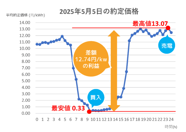 例えば右の2025年5月5日の実例でいうと、仮にこの日の最安値で3MW(3,000kW)蓄電し最高値で売電した場合、購入金額990円、売電価格39,210円となり、差額の38,220円が利益となる計算です。