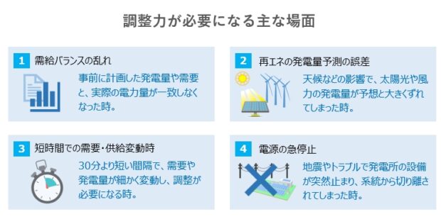 電力調整力が必要な場面は様々ありますが、主に右の4つが挙げられます。電力の調整力が必要になった時は、送配電事業者が調整力を使って、需要と供給のバランスを保ちます。