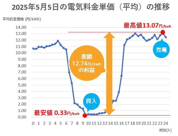 電気料金単価力が安いときに買って蓄電し、電気料金単価力が高くなった時に売電することでその差額が利益になります。